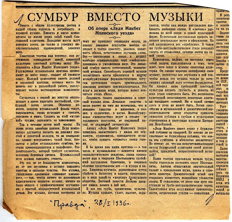 Некоторые театры как новинку, как достижение преподносят новой, выросшей культурно советской публике оперу Шостаковича «Леди Макбет Мценского уезда». Услужливая музыкальная критика превозносит до небес оперу, создает ей громкую славу. Молодой композитор вместо деловой и серьезной критики, которая могла бы помочь ему в дальнейшей работе, выслушивает только восторженные комплименты.